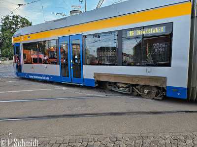 Heute Abend kam es zu einer Flankenfahrt am Hauptbahnhof. Dabei fuhr Fahrzeug 1210 wegen einer falsch stehenden Weiche in eine entgegenkommende Linie 15 ( Wagen 1201 ). Beide Fahrzeuge wurden dadurch erheblich in Mitleidenschaft gezogen. Bei dem Fahrzeug 1210 gibt es Schäden am Kopfteil. Bei dem Fahrzeug 1201 gibt es erhebliche Schäden am WGT 4+5.