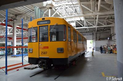 Bild: U-Bahn Berlin F76 2587 bei der Modernisierung im Werk Bautzner Straße zu einem Pressetermin im Jahr 2013. Im Hintergrund ein 6MGT 5616 zur Unfallinstandsetzung, der später auch im Straßenbahnhof Paunsdorf stand. Der letzte F Zug aus Berlin wurde dieses Jahr übergeben und der Auftrag ist somit abgeschlossen.