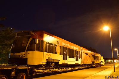 Bild: ein Flexity Link Zweisystemfahrzeug der Saarbahn beim Abtransport vom Technischen Zentrum Heiterblick