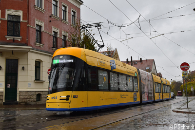 In den letzten beiden Tagen bekam der NGT10 1002 im Betriebshof Paunsdorf eine Vollwerbung für die Leipziger Verkehrsbetriebe / Abo. Heute fuhr die 1002 erstmals auf Linie 1 mit der Vollwerbung.