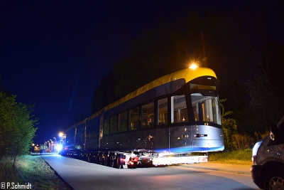 Exakt um 0:00 Uhr fuhr der Schwertransport mit 1025 die Abfahrt Leipzig Nordost entlang. Nach absprachen mit der Polizei und einer Technischen Panne am LKW setzte die Fuhre die Fahrt später langsam fort und erreichte 00:39 Uhr das Betriebsgelände in Heiterblick. Im laufe des heutigen Tages wird der Triebwagen vom LKW abgelassen und die Inbetriebnahme beginnt.