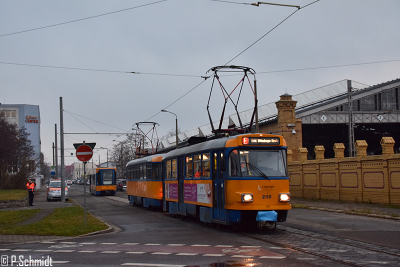 Bild: 2110+2085 Heck an Heck in der Bitterfelder Straße. Im Hintergrund Abgestellt Beiwagen 939.