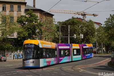 Der Wagen 1009 trägt eine Vollwerbung für die Stadt Leipzig / Demokratie. Das Fahrzeug wurde heute in der Messekehre präsentiert und fuhr eine medienwirksame Runde nach Plagwitz und zurück.