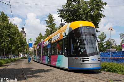 Der Wagen 1009 trägt eine Vollwerbung für die Stadt Leipzig / Demokratie. Das Fahrzeug wurde heute in der Messekehre präsentiert und fuhr eine medienwirksame Runde nach Plagwitz und zurück.