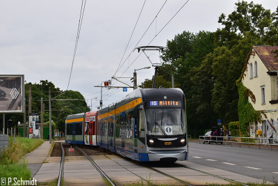 Die NGT12 stellten sich zwischen Meusdorf und Franzosenallee ab und warteten auf ihren Abfahrauftrag. Die Linie 15 fuhr in dieser Zeit eingleisig an den abgestellten Wagen vorbei,