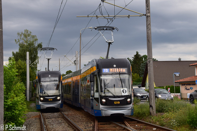 Die NGT12 stellten sich zwischen Meusdorf und Franzosenallee ab und warteten auf ihren Abfahrauftrag. Die Linie 15 fuhr in dieser Zeit eingleisig an den abgestellten Wagen vorbei,