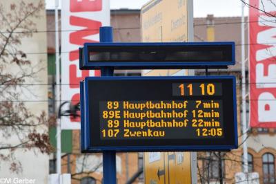 Bild: An der DFI werden die Fahrten vom Elektrobus als Linie 89E bezeichnet. An der Haltestelle Connewitz, Kreuz entstand dieses Foto.