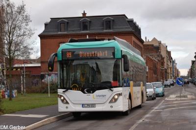 Bild: Wegen der defekten Fahrgastheizung, rückte der Testbus bereits 14:15 Uhr in den Bushof Lindenau ein. Das Foto zeigt den Bus 12277 an der Haltestelle Zollschuppenstraße auf dem Einrückeweg.