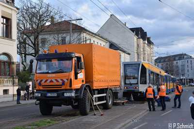 Bild: die Iftec samt Hilfswagenbesatzung hebt den Beiwagen wieder in das Stadtwärtige Gleis.