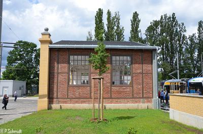 Die Abstellanlage für die Straßenbahn hat 12 Gleise auf der Freiabstellfläche und an der Ausfahrt ist das Portal der ehemaligen Holzhalle.