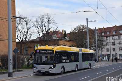 Fahrzeug 14242 fuhr früh und Nachmittag auf der Linie 60E Telemanngymnasium - Bushof Lindenau