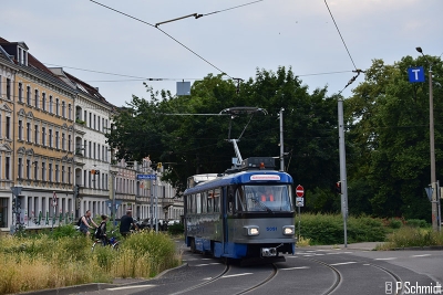 Heute hatte der Schienenschleifwagen 5091 den eingleisigen Abschnitt auf der Bornaischen Brücke abgenommen. Das Fahrzeug hatte erst vor kurzem Abnahme nach erfolgter Hauptuntersuchung und fuhr den zweiten Einsatz. Bereits am Freitag hat das Fahrzeug den neuen Abschnitt in der Huttenstraße abgenommen. Durch die Fahrleitungskanzel kann bei Abnahmen von Streckenabschnitten genau beobachtet werden, ob der Stromabnehmer direkt am Fahrdraht entlang läuft.