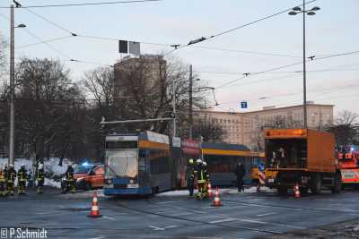 Heute kam es zu einem Verkehrsunfall zwischen dem NGT8 1122 und einem Getränke-LKW. Bei der seitlichen Berührung wurde der Triebwagen 1122 an der Front stark beschädigt in der Statik. Außerdem ist der Wagen entgleist. Die Strecke war mehrere Stunden zur Unfallaufnahme und Bergung gesperrt. Durch gleichzeitige Störungen in den Umleitungsstrecken am Goerdelerring und Michaelisstraße gab es Umleitungen, die ziemlich fernab der eigentlichen Linie waren. Linie 14 fuhr beispielsweise über Wittenberger Straße / Schönefeld.
