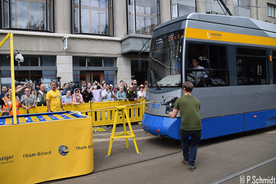 Disziplin 6: Mit dem Wagen 1124 so schnell und genau wie möglich gegen einen Ball fahren und damit die aufgebauten Kegel umstoßen ( Tram Bowling )