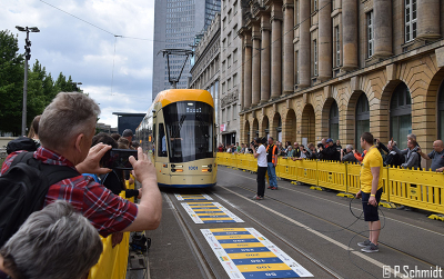 Disziplin 6: Mit dem Wagen 1124 so schnell und genau wie möglich gegen einen Ball fahren und damit die aufgebauten Kegel umstoßen ( Tram Bowling )