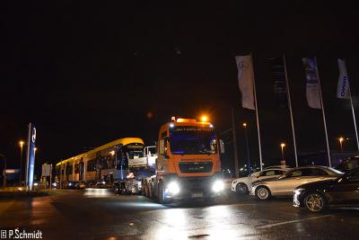 In dieser Nacht wurde der NGT10 1002 vom Messegelände nach Heiterblick ins Technische Zentrum überführt. Dort wird er in den nächsten Wochen für die Inbetriebnahme vorbereitet. Der Abtransport war dieses Mal durch den Regen ein Problem, durch den aufgeweichten Boden fuhr der Schwertransport sich stellenweise fest und es mussten Spezialmatten und Stahlplatten auf den Wiesen verlegt werden.