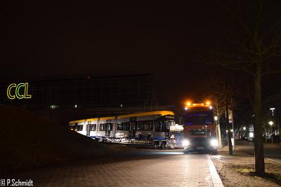 In dieser Nacht wurde der NGT10 1002 vom Messegelände nach Heiterblick ins Technische Zentrum überführt. Dort wird er in den nächsten Wochen für die Inbetriebnahme vorbereitet. Der Abtransport war dieses Mal durch den Regen ein Problem, durch den aufgeweichten Boden fuhr der Schwertransport sich stellenweise fest und es mussten Spezialmatten und Stahlplatten auf den Wiesen verlegt werden.