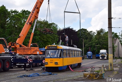 Bereits seit 21.05. wurden im Betriebshof Leutzsch 6 abgestellte T4D-M aus der Wittenberger Straße verladen. Die Fahrzeuge werden dabei durch ein Schlepp bzw. Führungsfahrzeug in der Wittenberger Straße angekuppelt und fahren teilweise noch selbst nach Leutzsch. Die Fahrzeuge waren betriebsbereit abgestellt und es wurden nur wenige technische Teile wie ITCS, Ticket-Automaten, Videoüberwachung, Entwerter und Linienfilme ausgebaut.