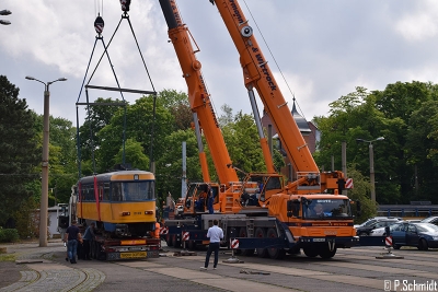 Mit dem Führungsfahrzeug 2120 wurden am 21.05.19 die Triebwagen 2162 und 2139 überführt, sowie 2155 mit 2153. 2139, 2162 und 2153 wurden noch am selben Tag mittels zweier Schwerlastkräne auf die Tieflader gehoben. Dabei wurden dann noch Drehgestellblenden, Stromabnehmer und Umformer+Abdeckung abgebaut und im Fahrzeug verstaut.