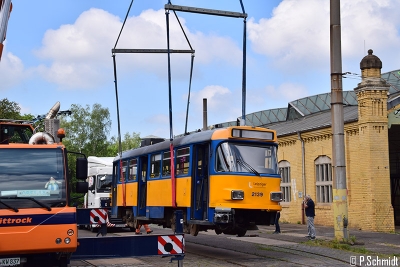 Mit dem Führungsfahrzeug 2120 wurden am 21.05.19 die Triebwagen 2162 und 2139 überführt, sowie 2155 mit 2153. 2139, 2162 und 2153 wurden noch am selben Tag mittels zweier Schwerlastkräne auf die Tieflader gehoben. Dabei wurden dann noch Drehgestellblenden, Stromabnehmer und Umformer+Abdeckung abgebaut und im Fahrzeug verstaut.