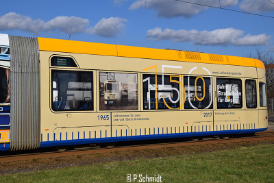 Seit Montag wurde der NGT10 1001 mit einer Vollwerbung für das Jubiläum "150 Jahre Leipziger Straßenbahn" beklebt. Der Wagen ist beklebt mit verschiedenen Bildern aus vergangenen Tagen der Leipziger Straßenbahn.
