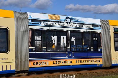 Seit Montag wurde der NGT10 1001 mit einer Vollwerbung für das Jubiläum "150 Jahre Leipziger Straßenbahn" beklebt. Der Wagen ist beklebt mit verschiedenen Bildern aus vergangenen Tagen der Leipziger Straßenbahn.