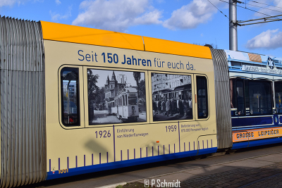 Seit Montag wurde der NGT10 1001 mit einer Vollwerbung für das Jubiläum "150 Jahre Leipziger Straßenbahn" beklebt. Der Wagen ist beklebt mit verschiedenen Bildern aus vergangenen Tagen der Leipziger Straßenbahn.