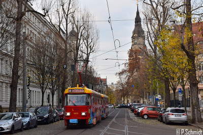 Heute fand die letzte Fahrt für den Triebwagen 1800 in Leipzig statt. Bei beiden Triebwagen laufen die Fristen aus, darum durfte ein kleiner Kreis der Stadtrundfahrtsfahrer nochmal mit "ihrem" Fahrzeug eine kleine Runde durchs Netz drehen. Beide Fahrzeuge sollten bereits 2019 abgestellt werden siehe Bildnews . Damals gab es aber ettliche Beschwerden, so dass zumindest die Triebwagen eine Inspektion sowie ein neues Glasdach bekamen. Der Beiwagen 700 wurde damals im Hist. Strbf. abgestellt. Durch die Coronalage und die starken Einbußen durch sinkende Ticketverkäufe, stellt man die Stadtrundfahrt in Leipzig vorerst ein. Am 16.11. konnte man ein letztes Mal Öffentlich mit dem Triebwagen 1800 mitfahren, der Triebwagen war zusammen mit 2060+918 auf Linie 3 im Öffentlichen Einsatz.