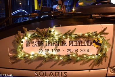 In der heutigen Nacht wurde das Jubiläum 20 Jahre Nightliner gefeiert. Dazu wurden 3 Busse zur Erkennung geschmückt. In der Nacht vom 29.08.1998 auf den 30.08.1998 fuhren erstmals die Nightliner N1-N9. Damals mit Stammfahrzeugen des Typs MAN NL 202 die extra mit einer Nachtbuswerbung ausgestattet wurden. Die Abfahrten erfolgen seit jeher um 1:11, 2:22, 3:33 Uhr ab Hauptbahnhof. 2006 kamen dann noch Freitag und Samstagnacht die „Babynightliner“ dazu mit den Abfahrten 1:45 Uhr und 3:00 Uhr. Von 2004 bis 2013 fuhr die Linie N10 nach Zwenkau, anfangs sogar mit Zwenkauer Fuhrpark.