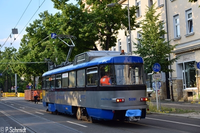 Heute hatte der Schienenschleifwagen 5091 den eingleisigen Abschnitt auf der Bornaischen Brücke abgenommen. Das Fahrzeug hatte erst vor kurzem Abnahme nach erfolgter Hauptuntersuchung und fuhr den zweiten Einsatz. Bereits am Freitag hat das Fahrzeug den neuen Abschnitt in der Huttenstraße abgenommen. Durch die Fahrleitungskanzel kann bei Abnahmen von Streckenabschnitten genau beobachtet werden, ob der Stromabnehmer direkt am Fahrdraht entlang läuft.